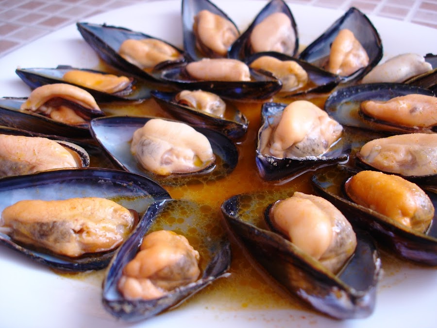 Al momento de comer hervir los mejillones y arreglarlos en una bandeja como en la foto.