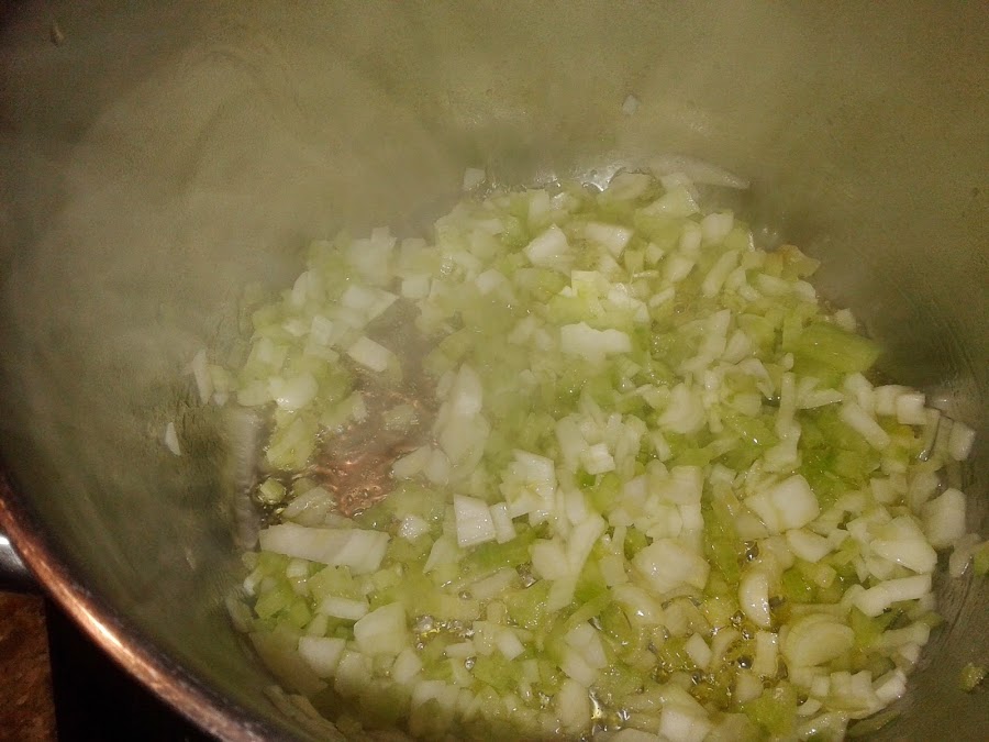 Cuando el aceite esté bien caliente añadimos el apio y la cebolleta picadas y lo rehogamos 5 minutos.