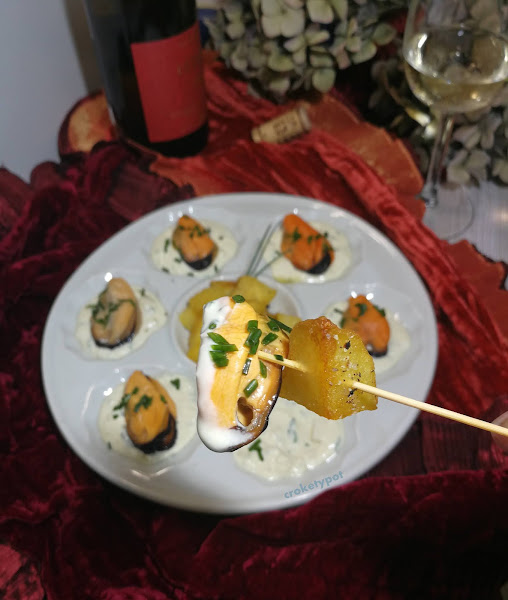 INGREDIENTES: 1 kilo de mejillones, 2 cucharadas de crema agria, 2 cucharadas de mostaza, 2 cucharadas de mahonesa, 1/2 cebolla muy picada, 1 cucharada de vino blanco seco. Cebollino picado. Una patata de guarnición cocida.
