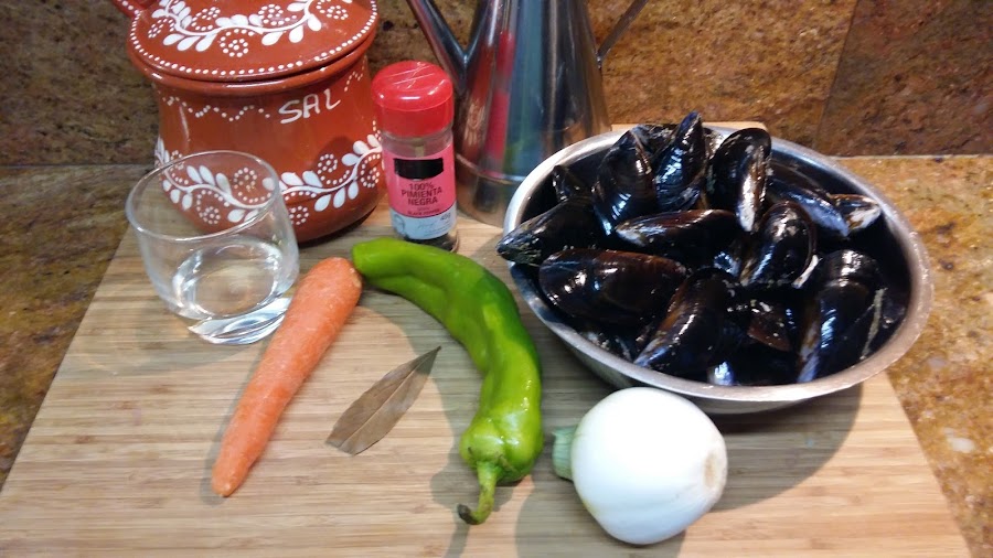 2 kg de mejillones, 1 cebolla tierna, 2 zanahorias, 1 tallo de apio, 1 pimiento verde pequeño, 1/2 vaso devino blanco seco, 2 hojas de laurel, aceite de oliva, pimienta y sal.