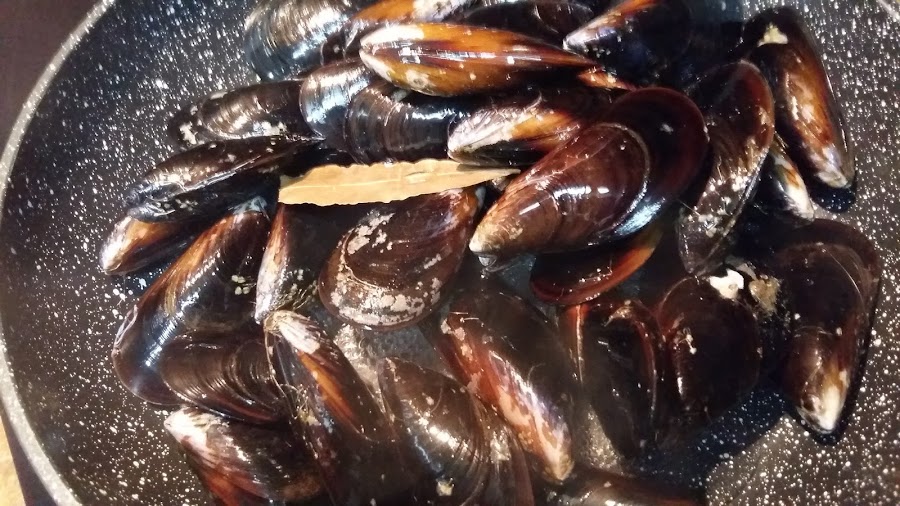 Limpiar los mejillones y colocarlos en una sarten , junto con el vino blanco y las hojas de laurel.