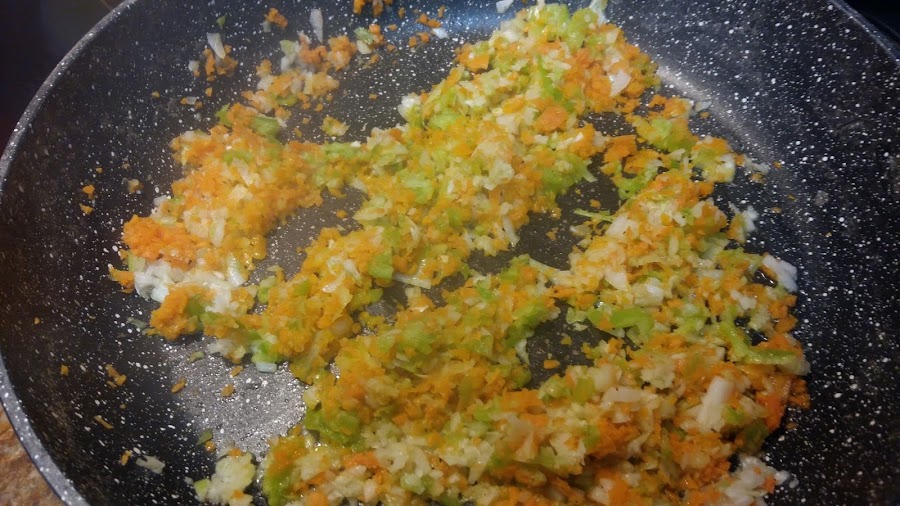 Picar muy pequeñito todas las verduras y pochar en la misma sarten con 1 cucharada de aceite de oliva hasta que tomen color.