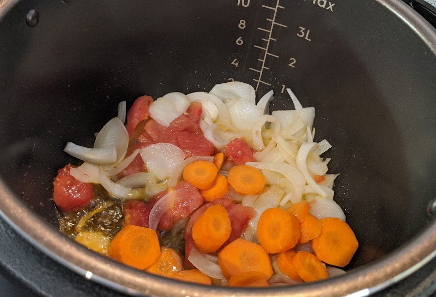 Lavamos la cubeta y ponemos la cebolla cortada, la zanahoria pelados y troceada, los tomates pelados y troceados y el aceite. Dejamos que se rehogue 2 minutos en menú fry (freír)