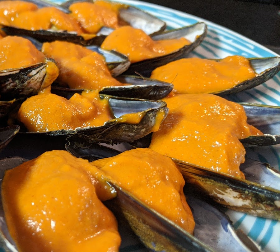 Y con una cuchara servimos una cantidad generosa de salsa, para que quede cubierto cada mejillón
