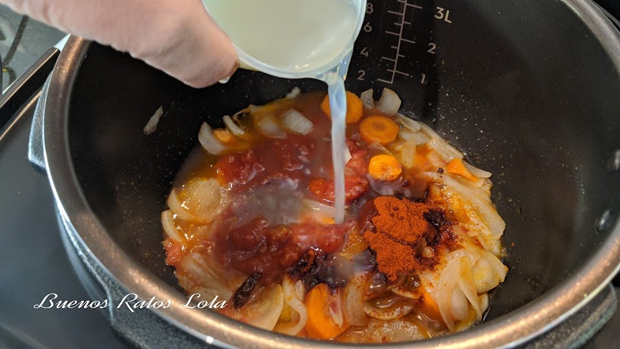 Cancelamos y añadimos el pimentón, la cayena y un vaso medidor de caldo de cocción reservado