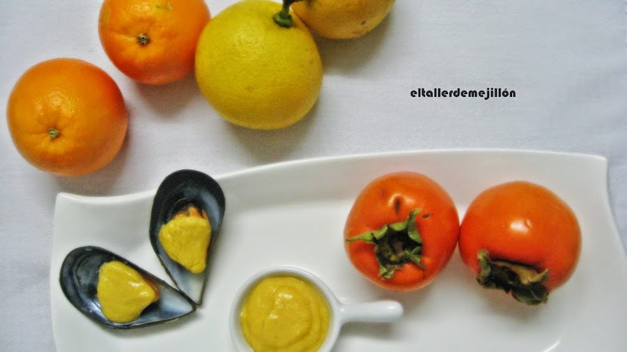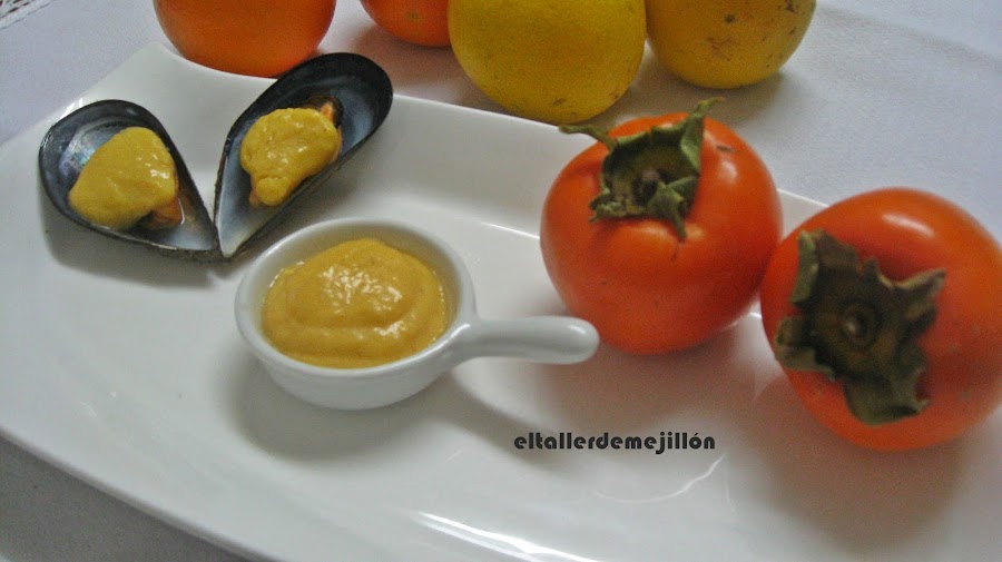 He de confesar que esta fruta no es de mis preferidas pero suele frecuentar el frutero de mi casa por estas fechas y no me he podido resistir a su precioso color naranja. Por algún tipo de intuición culinaria creí que el caqui, junto con el limón y la naranja, podría casar estupendamente con el mejillón y así ha sido. El toque marino del mejillón con el punto cítrico de la salsa es realmente una delicia para el paladar. Espero que os guste!