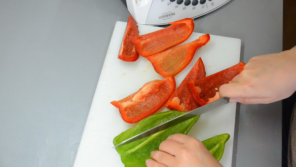Trocea la cebolla en cuatro partes, parte los pimiento en trozos grandes y pon todo en el vaso de la Thermomix para trocear durante 3 seg/vel 5.