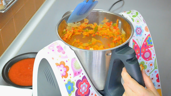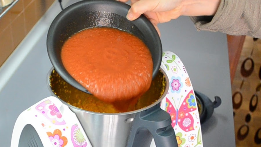 Esta receta la he elaborado con ayuda de la Thermomix pero se puede preparar de igual modo de la forma tradicional sofriendo la salsa de tomate picante en la sartén, y triturando con la batidora común. Quedará igual de rico.