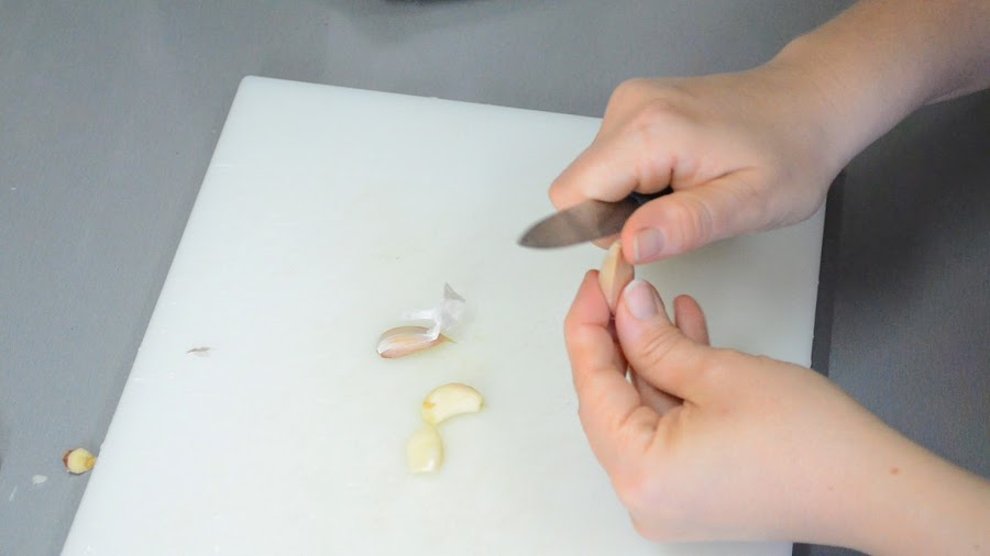 Pela los dientes de ajo e incorpora al sofrito en marcha.