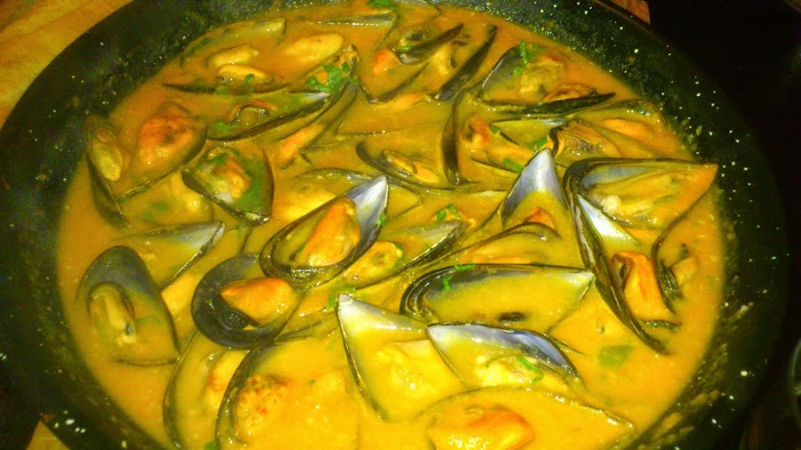 Vertemos la salsa en una cazuela, reincorporamos el laurel y añadimos los mejillones. Si la salsa queda demasiado espesa para nuestro gusto podemos añadir más caldo de mejillón.