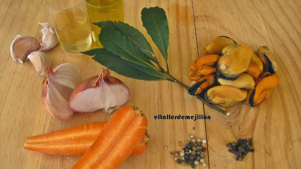 Ponemos en una sartén los 60 ml de aceite de oliva a calentar para añadir la zanahoria y a continuación la cebolla. Dejamos que se vaya haciendo a fuego lento y añadimos dos dientes de ajos machacados y uno cortado en láminas y la pimienta, el clavo y la hoja de laurel partida en dos.