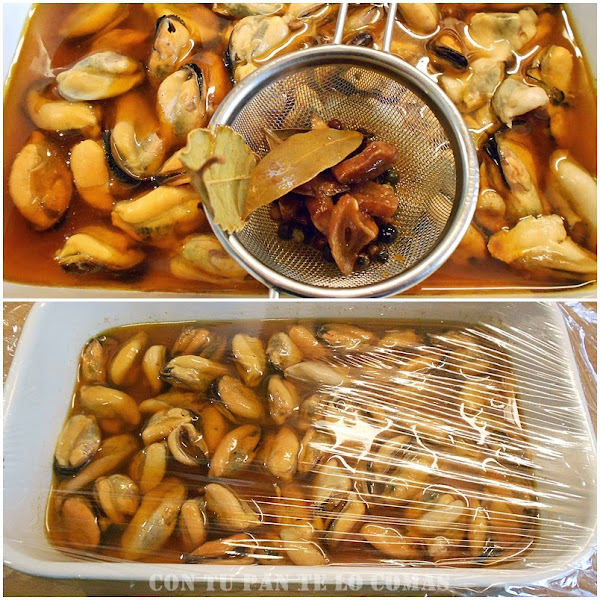 4. En un recipiente disponemos los mejillones ya sin las conchas y colamos el escabeche encima. Es importante que los cubra por completo. Podrías hacerlo sin colar, pero como le toque a alguien algún granito de pimienta no le va a hacer mucha gracia.