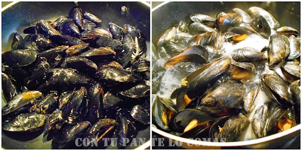 1. Limpiamos los mejillones. Ya te he dicho que no hay que entretenerse mucho con las conchas, así que solamente les quitaremos las barbas. Los ponemos en una cazuela con el vino blanco a fuego vivo hasta que se abran. Los retiramos para que se enfríen un poquito y poder retirarlos de las conchas. Yo no les pongo sal porque me parece que no la necesitan.