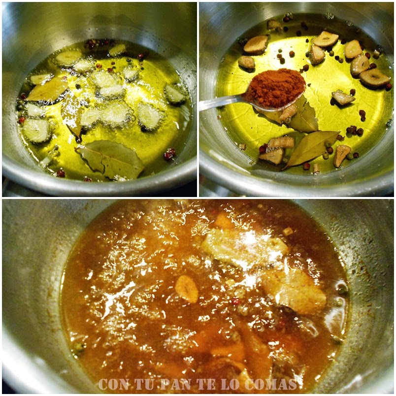 3. Apagamos el fuego y en un par de minutos que se habrá enfriado un poquito, añadimos el pimentón, removemos rápidamente para que no se queme y enseguida añadimos el vinagre (cuidado que puede saltar bastante).
