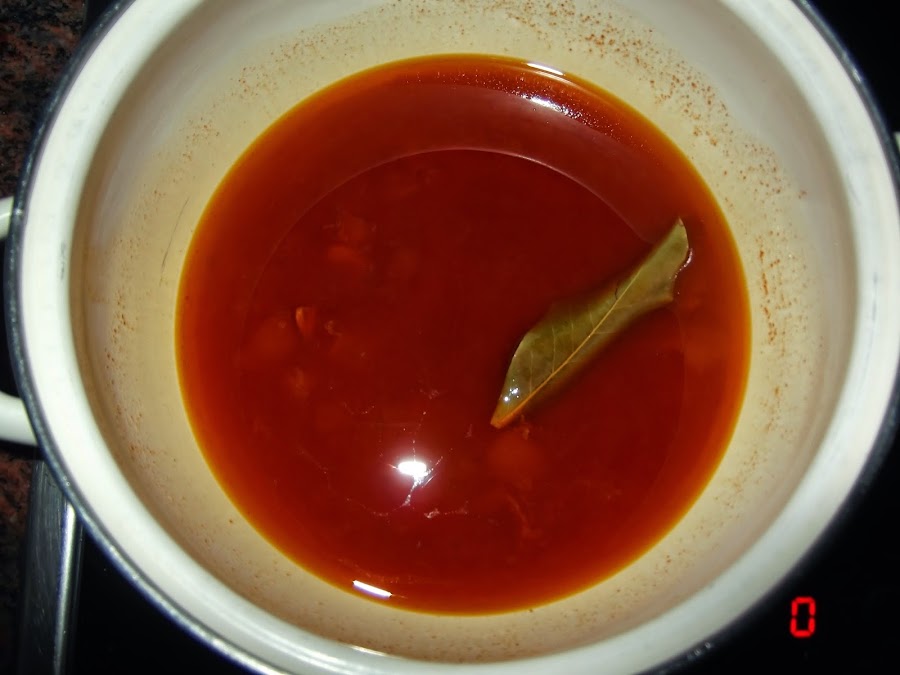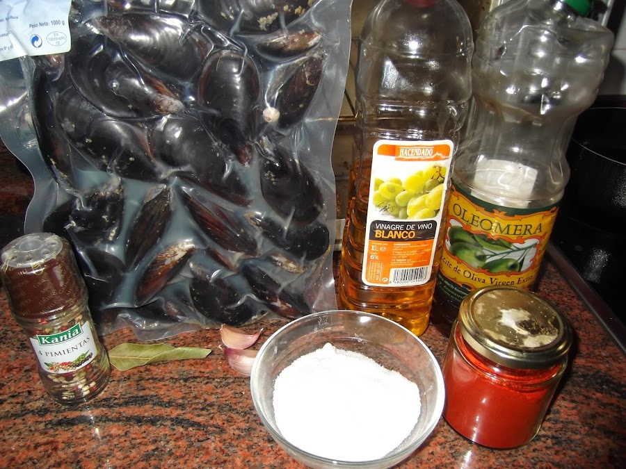 Ahora nos ponemos a preparar el escabeche. En un cazo ponemos a calentar el aceite, cuando este un poco caliente añadimos los ajos fileteados y el laurel. Vamos dejando que se hagan poco a poco y cuando estén un poco dorados, apartamos del fuego y añadimos el pimentón y el vinagre y volvemos a poner al fuego suave durante cinco minutos más. Volcamos sobre los mejillones hasta cubrirlos por completo y lo dejamos reposar un par de días.