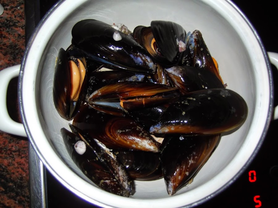 Lo primero que hacemos es limpiar los mejillones. En una olla echamos un poco de agua y un poco de sal y cuando esté hirviendo añadimos los mejillones, tapamos la olla y la dejamos dos minutos hasta que se abran. Luego los dejamos en un plato para que se sequen, si alguno no se abre lo tiramos, y les quitamos la concha una vez que se hayan templado.