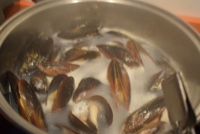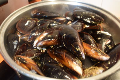 Limpiamos los mejillones. Quitamos las barbas. Ponlos en una cazuela con el vino blanco a fuego vivo hasta que se abran.