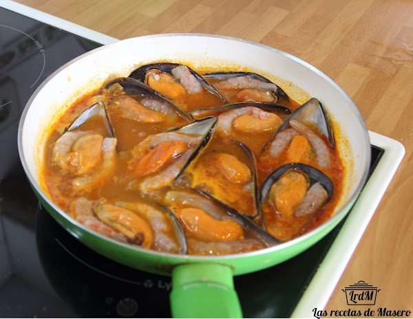 Vamos colocando los mejillones dentro del caldo. Si os sobran gambas, las añadimos sueltas al caldo. Echamos la guindilla al gusto. Dejamos cocer diez minutos a fuego medio, retiramos del fuego y servimos en la sartén (ver la siguiente foto).