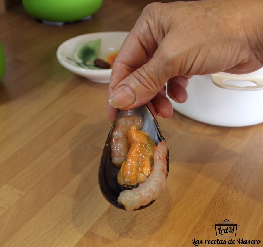 Mientras, preparamos los mejillones. Quitamos la concha de encima y les colocamos un par de gambas peladas (ver la siguiente foto).