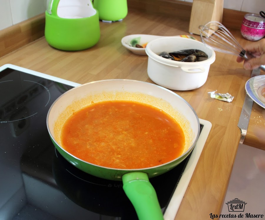 Seguidamente, añadimos el caldo de los mejillones y la media pastilla de avecrem desmenuzada. Se deja cocer durante 10 minutos a fuego bajo (ver las siguientes 3 fotos).