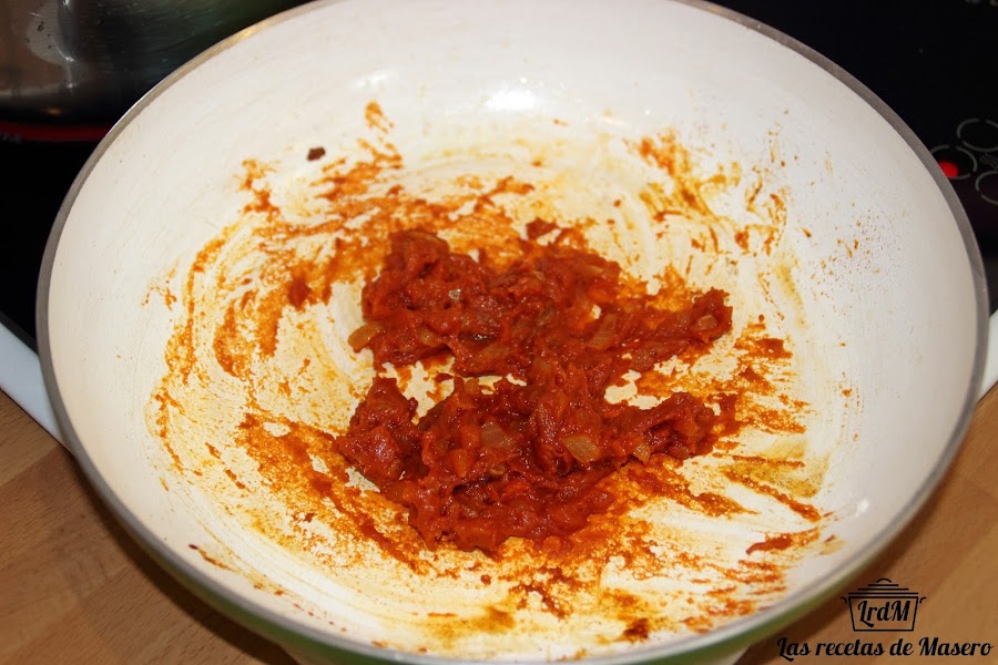 En una sartén con un chorrito de aceite sofreímos la cebolla picadita hasta que esté transparente. Añadimos la harina y la doramos un poquito para que no sepa crudo. Añadimos el pimentón, movemos para que se integre bien y no se queme, echamos el tomate y lo mezclamos todo(ver la siguiente foto)