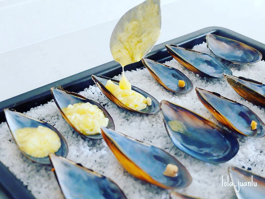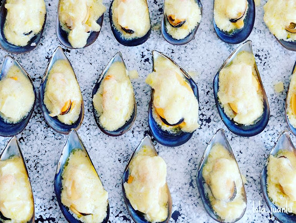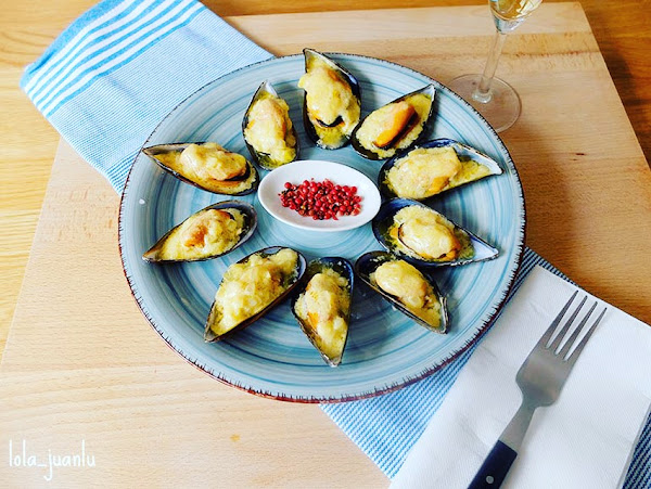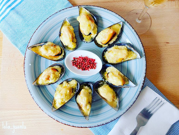 Transcurrido el tiempo de horneado, sacamos la bandeja y sólo queda servir estos deliciosos mejillones en salsa francesa de champagne.