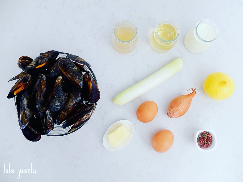 Ahora nos ponemos con la salsa, para ello, picamos la cebolla y el puerro en brunoise (muy picado). Ponemos una sartén a fuego medio con la mantequilla. Cuando la mantequilla se haya derretido, agregamos la cebolla y el puerro y pochamos durante 10 minutos o hasta que cambien de color y se vuelvan transparentes. A media cocción añadimos el jugo de los mejillones para terminar con el sofrito. Con este jugo le aportamos sabor sin necesidad de agregar sal a la salsa.