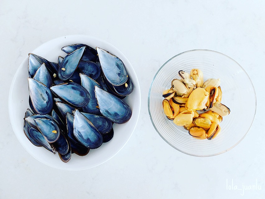Los mejillones que vamos a utilizar ya vienen hervidos y envasados al vacío, pero podemos comprarlos frescos y hervirlos nosotros.