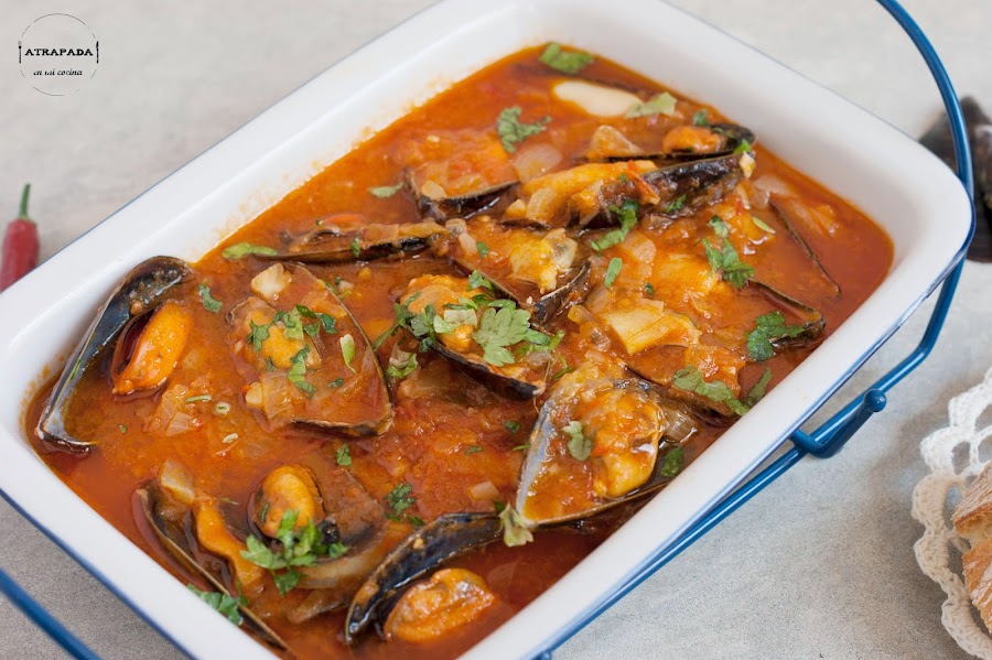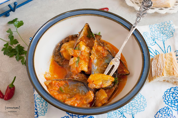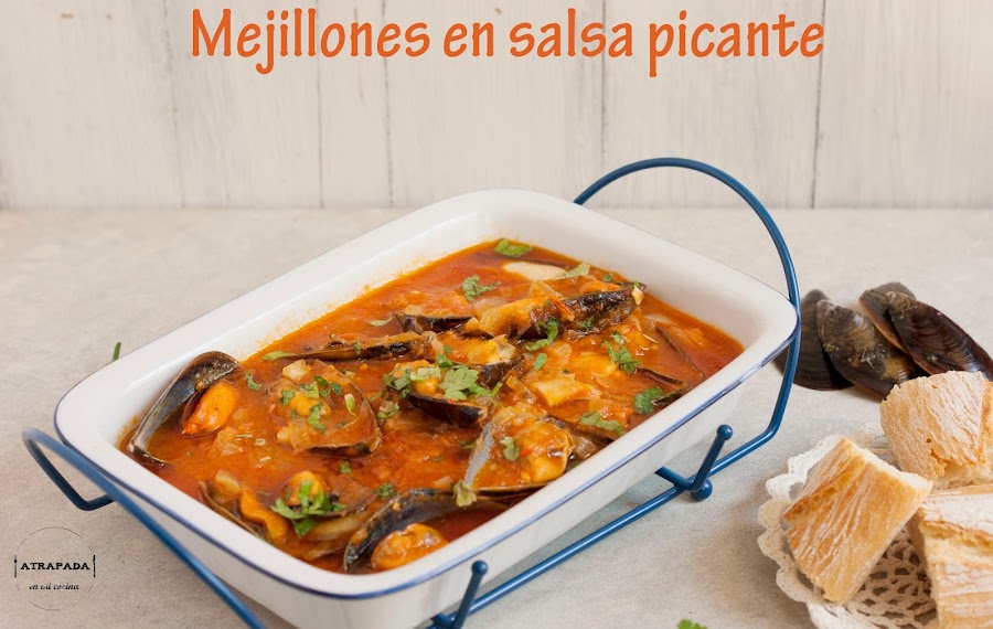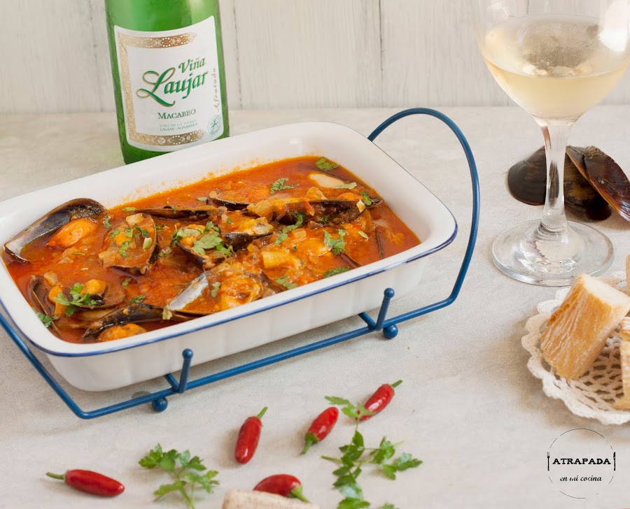 Seguimos con platos que vienen muy bien para el verano. Los mejillones los tenemos todo el año en las pescaderías, pero es verdad que hay épocas en las que no están en su mejor momento. Este último mes los he comido en varias ocasiones y ninguna de ellas me han defraudado. En esta ocasión quería ponerle una salsa picante y cambiar un poco la forma de tomarlos. La sorpresa ha sido que la salsa nos ha entusiasmado en casa, sobre todo a mi marido, que no suele tomar pan en las comidas y que en ésta no paró de mojar pan. Sin duda el secreto de estas salsa está en usar salsa de tomate casera. La salsa picante se la vi a Pam en Directo al Paladar, y como siempre las recetas de ella no suelen fallar. He incrementado la cantidad de salsa de tomate que venia en la original y he cambio la cayena por un trozo de guindilla de las que mi suegro tiene plantadas. Lo he cocinado y maridado con el mismo vino, un blanco Macabeo de Viña Laujar, de la Alpujarra almeriense, que bien fresquito acompaña muy bien a estos mejillones.