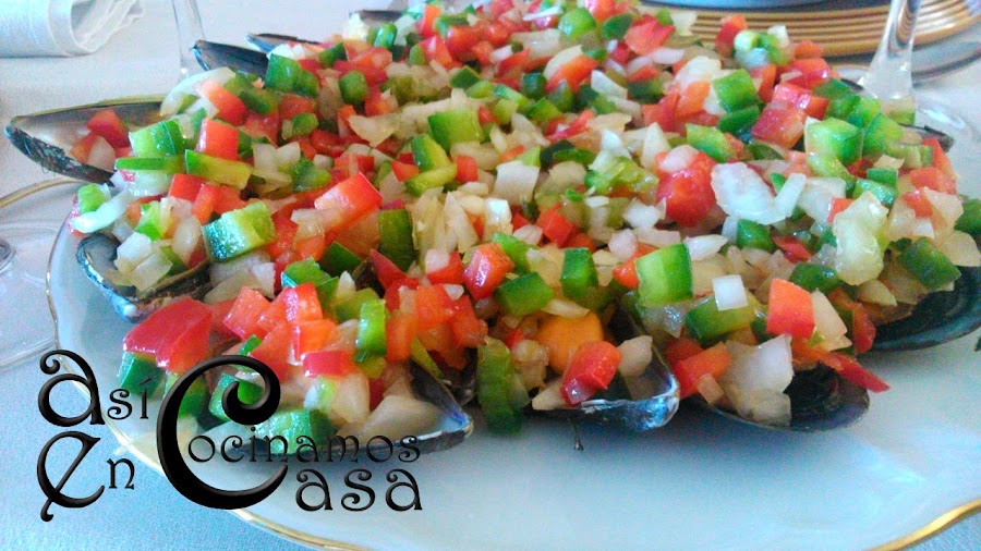 Esperaremos a que se enfríen los mejillones. Mientras picamos fino los pimientos y la cebolla. Ponemos en un plato los mejillones y añadimos por encima la picada que acabamos de hacer. Salamos al gusto y regamos con un chorro de aceite de oliva y vinagre...