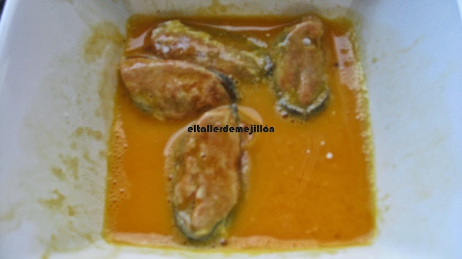 A continuación batimos un huevo y pasamos los mejillones por él.