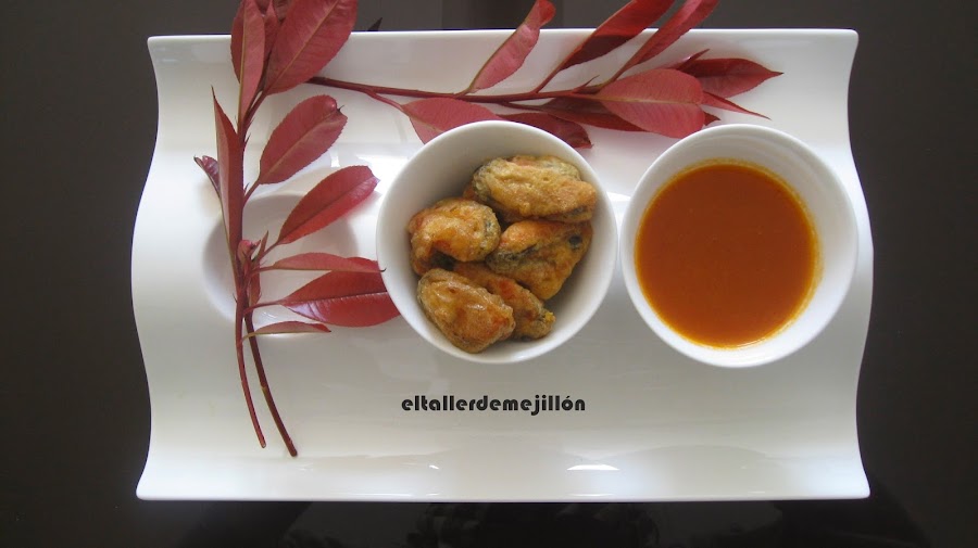 Tenemos los mejillones cocidos y desconchados, los secamos bien. Los salpimentamos y los rebozamos en harina.