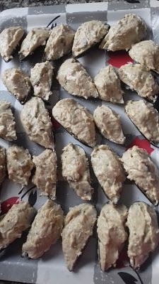 Saca esta masa del vaso, espera a que se enfríe un poco y deja reposar unas horas en el frigorífico tapada con papel film. Pasado este tiempo rellena con ella, ayudándote de una cuchara, las conchas de los mejillones que teníamos reservadas.