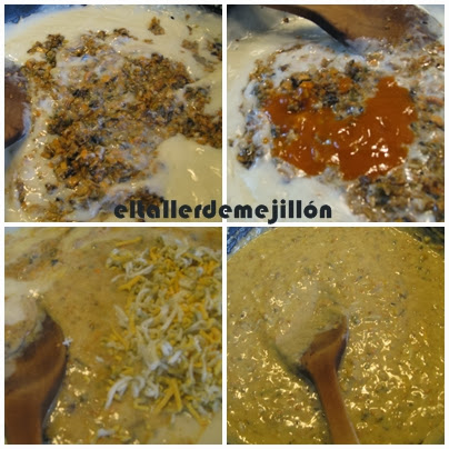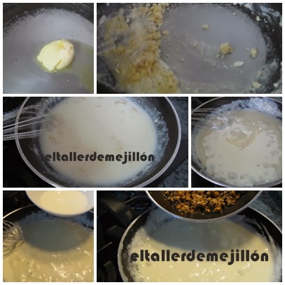 Comenzamos con la bechamel, que no es uno de mis fuertes. Antes de nada se diluye la harina refinada en 30 ml de leche.Ponemos la mantequilla en una sartén para que se vaya derritiendo y añadiremos la harina dándole vueltas, cuando haya obtenido una coloración dorada agregamos los 120 ml de leche sin parar de remover. Cuando la mezcla sea homogénea añadimos el agua de mejillón, la nata (crema de leche) líquida y la disolución que tenemos, de leche y harina refinada.