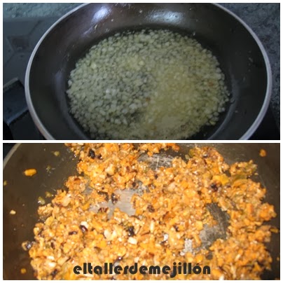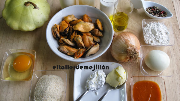 Pelamos y cortamos la cebolla muy fina y la ponemos en 30 ml en aceite de oliva en una sartén para que se dore. A continuación picamos los mejillones, que hemos obtenido en la cocción, con cuchillo y muy fino. Los rehogamos con la cebolla y lo apartaremos para agregar una vez que hayamos realizado la bechamel.