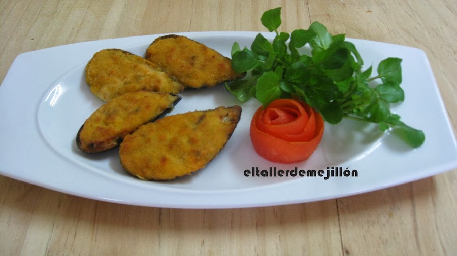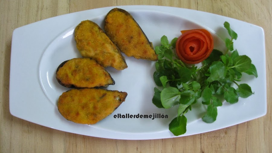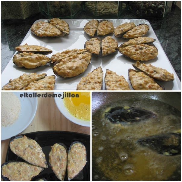 Este mejunje está listo para salpimentar, y como he puesto en los ingredientes mejor con mucha, mucha pimienta. Se comenzarán a rellenar las conchas que hemos guardado, previamente lavadas, las rebozamos con huevo y pan rallado para pasar a freírlos, solamente por la parte donde está el rebozado sin darle vuelta. En cuanto se doren se retiran y los ponemos sobre papel de cocina para que absorba el exceso de aceite.