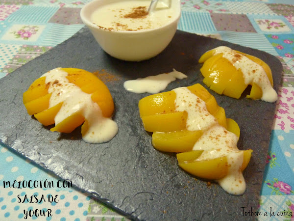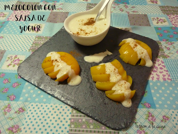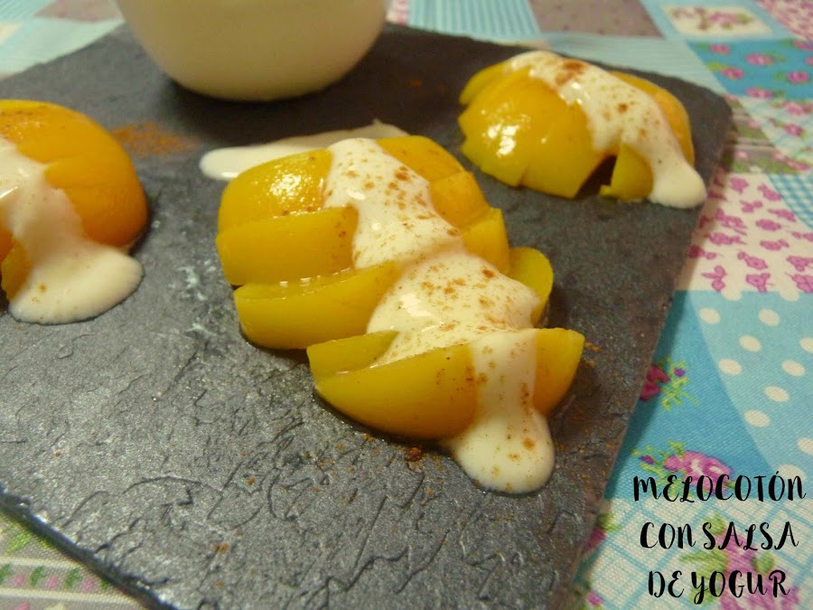 He preparado una salsa de yogur para acompañar melocotones en almíbar, que aunque estemos en la época de ellos al natural, los de conserva son muy versátiles y frescos para el verano.
