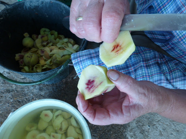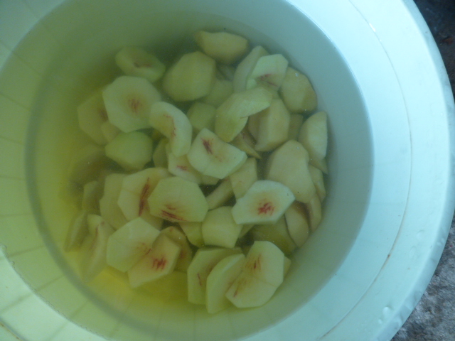 Ya pelados cortamos en trozos aprovechando todo el melocotón. Los ponemos en agua para que no se queden feos.