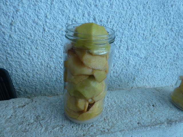 Ya con los tarros limpios, las tapas esterilizadas y el melocotón pelado y limpio procedemos a llenar los tarros de cristal.
