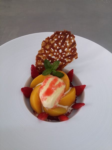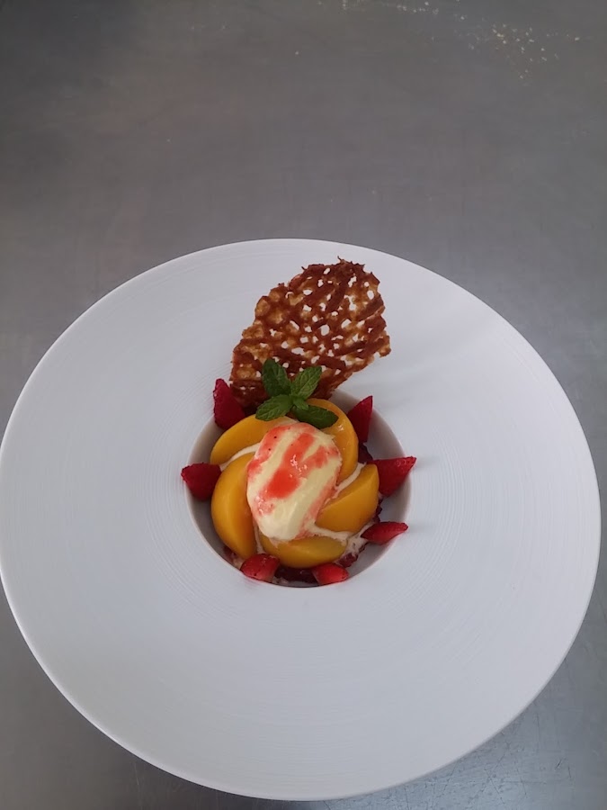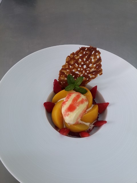 Preparación: Las yemas se baten con el azúcar, la harina y un poco de la leche, para facilitar el batido. Calentar el resto de la leche y agregar el batido anterior. Sin dejar de remover esperar que espese y haya cocido de forma que no se corte, al añadir un poco de harina no se puede cortar la crema, de forma que cuezan las yemas y queden perfectamente higienizadas. Una vez que tenemos la crema ya hecha. Retirar del fuego, dejar enfriar. Cuando la crema esté fría añadir la nata (crema de leche) líquida y mezclar bien .Luego poner en heladora, quien la tenga o en un recipiente de plástico pues queda menos cristalizado y poner en el congelador. Cuando esté a medio helar lo sacamos, lo removemos bien o lo batimos para romper los cristales y volvemos al congelador. Podemos hacer esto otra vez más y dejar hasta que esté helado. Una vez hecho el helado, sacarlo un rato antes del congelador para que tome la temperatura idónea para poder obtener bolas. Hacer bolas, poner en una copa, colocar los medios melocotones en compota o almíbar ligero, rociar con el coulis o salsa de frambuesa y adornar al gusto. En una jarrita aparte se puede poner más coulis o salsa de frambuesa para que cada uno se ponga más si lo desea. Todo un clásico de la heladería que siempre está de moda.