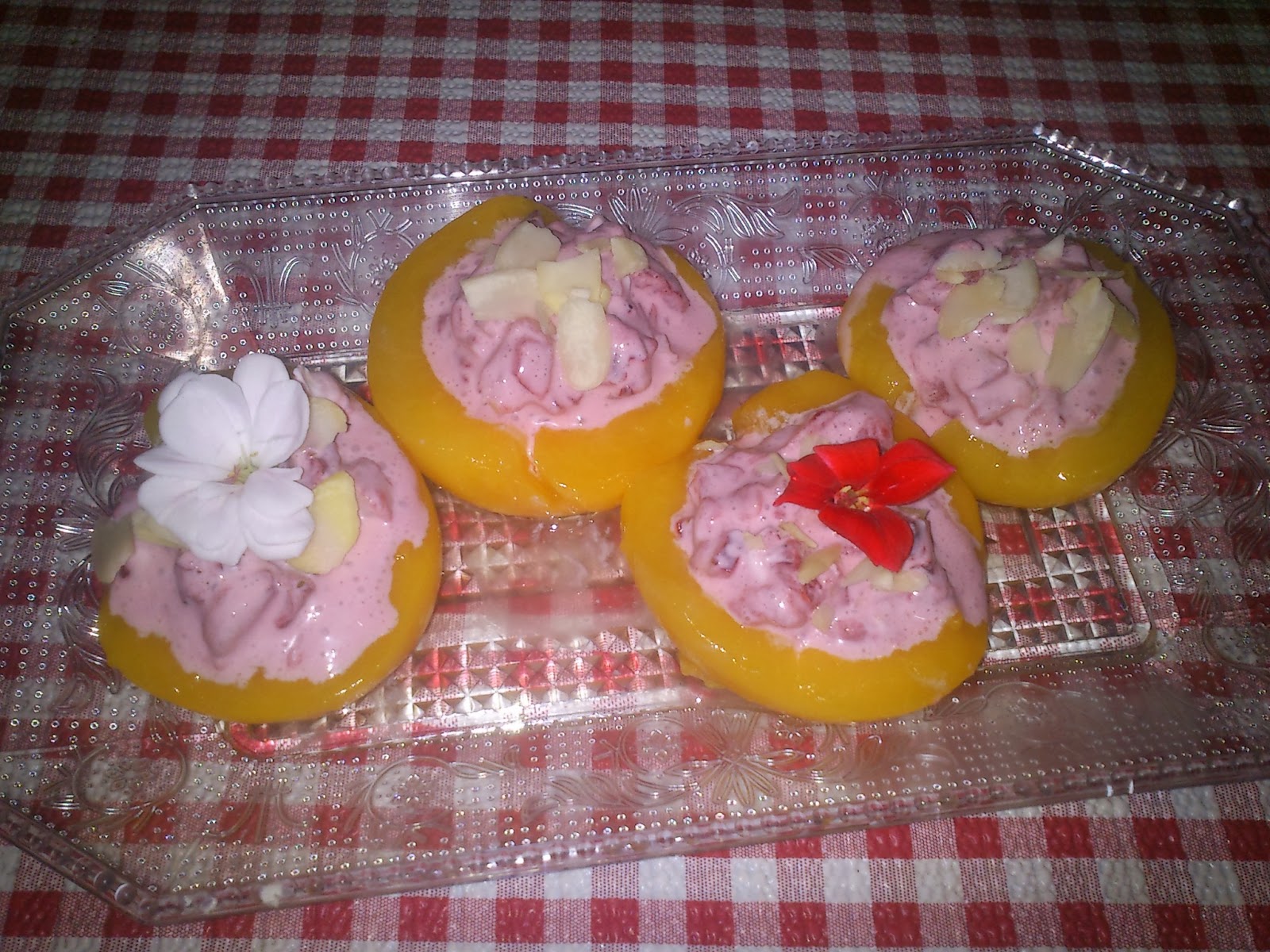 En un bol ponemos los yogures y añadimos la picada de fresas, removemos bien y rellenamos con ello los melocotones.