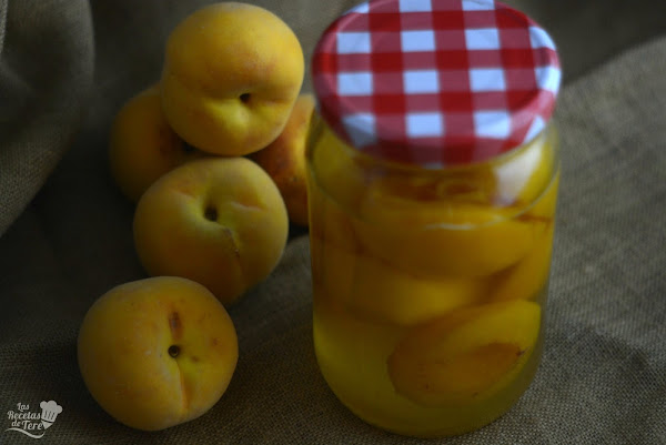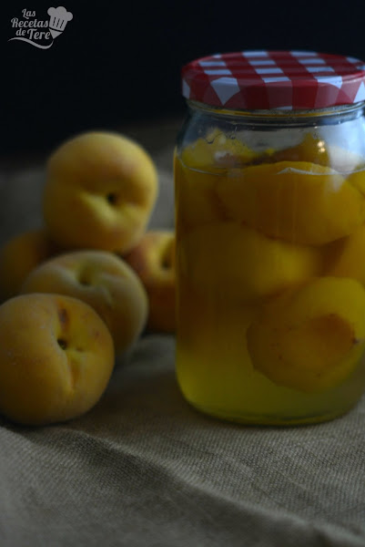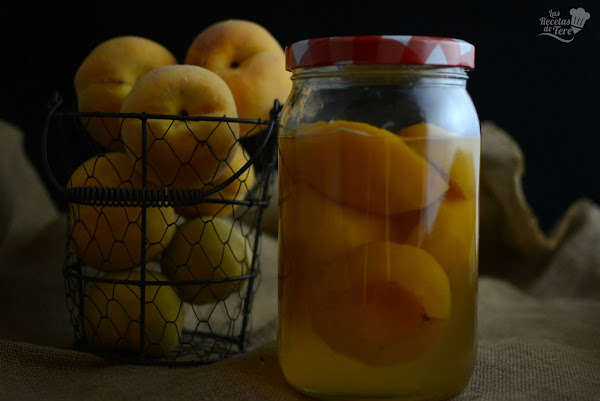 En una olla pones a hervir el agua junto con el azúcar, deja reducir el agua por unos 10 minutos, luego le agregas las mitades de lo melocotones y la hierbabuena, deja hervir a fuego medio por otros 15 minutos, le agregas la ginebra y retiras del fuego.Si no los vas a consumir al momento, hierve previamente por 10 minutos el envase de vidrio donde lo vayas a conservar. Con una cuchara grande sacas los melocotones, después con un colador (para evitar que las hojas de hierbabuena caigan en el almíbar), echas el almíbar en el envase que herviste y como último paso metes los melocotones en ese mismo almíbar, deja enfriar antes de refrigerar.