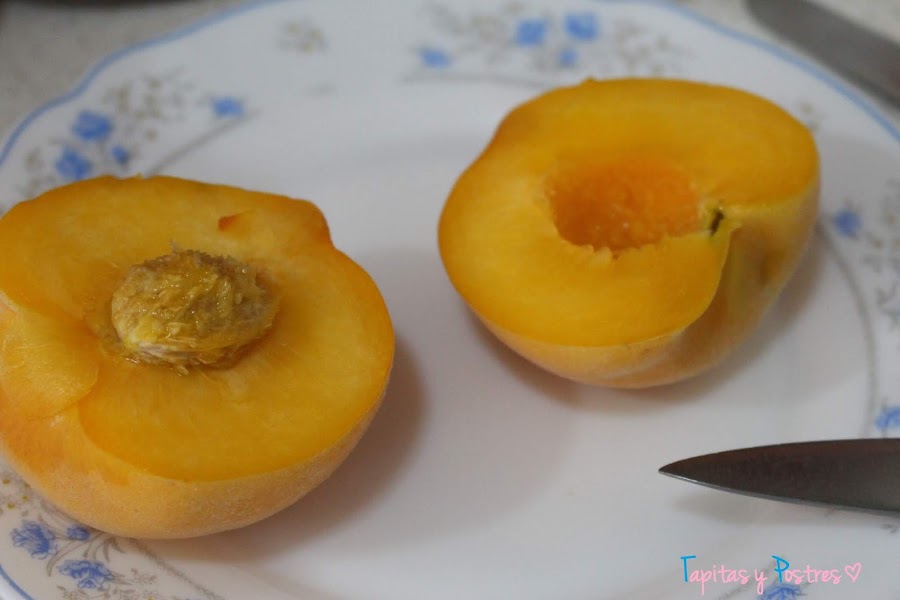 Sin pelar los melocotones, los cortamos por la mitad.Luego los pelamos y quitamos el hueso.
