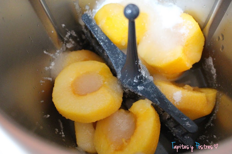Para hacer sin thermomix, haremos primero el almíbar calentando el agua con el azúcar y el zumo de limón. Cuando hierva, vertemos el almíbar sobre los melocotones ya pelados y deshuesados. Procurad que el cazo donde lo tengáis no sea muy grande para que el almibar cubra bien los melocotones. Ahora dejamos reposar una hora aproximadamente. A continuación ponemos el cazo al fuego y dejamos que hierva todo unos cinco o diez minutos.