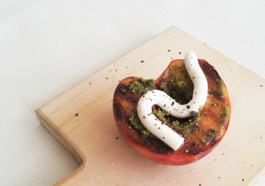 Lavar muy bien el melocotón, cortarlo a la mitad y espolvorearles a cada mitad sal y pimienta. Calentar el sartén y poner las mitades boca abajo hasta que doren. Servir cada mitad con una cucharadita de pesto y con queso crema. ¡Sencillísimo!