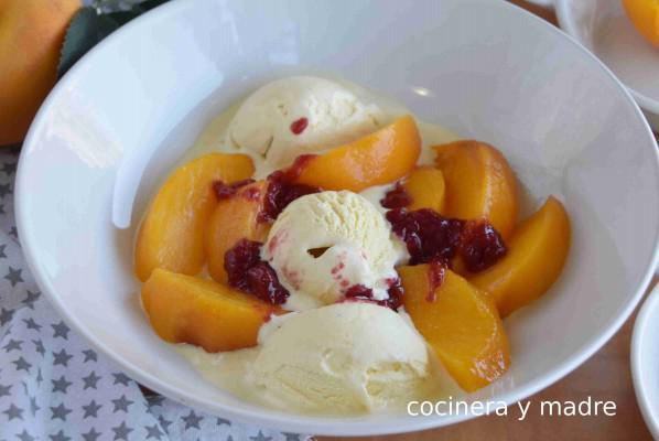 En la base de un plato, cuenco o bol ponemos unas bolas de helado de vainilla, junto a estas el melocotón 1 o 1/2 por ración como prefiráis, y por último le añadimos la mermelada por encima y listo para comer.