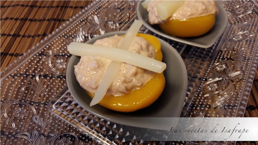 Mezclamos el resto de ingredientes, menos los espárragos, y rellenamos los melocotones con esta mezcla.