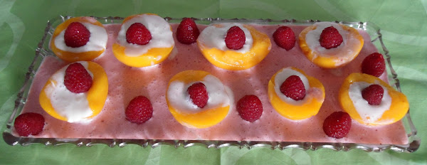 Se rellenan los melocotones y con la mezcla que queda se le echa un par de fresas (para darle color y se vuelve a batir) se pone en el fondo de la fuente, los melocotones y se adorna con las frambuesas (si se quiere se espolvorea con canela en polvo) y listo.