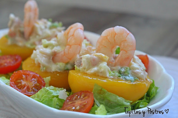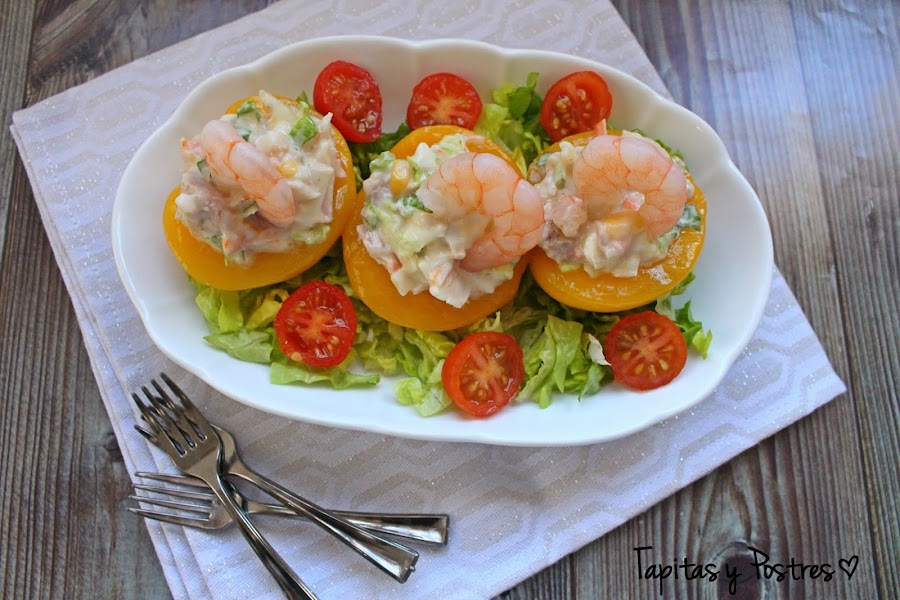 Lo primero que haremos es pelar y cocer las gambas unos tres minutos. las apartamos del fuego y refrescamos. las hacemos trocitos, reservando una gamba para adornar cada mitad de melocotón.
