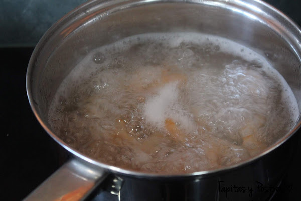 Cocemos las gambas unos dos o tres minutos. Las sacamos y enfriamos para cortar la cocción.